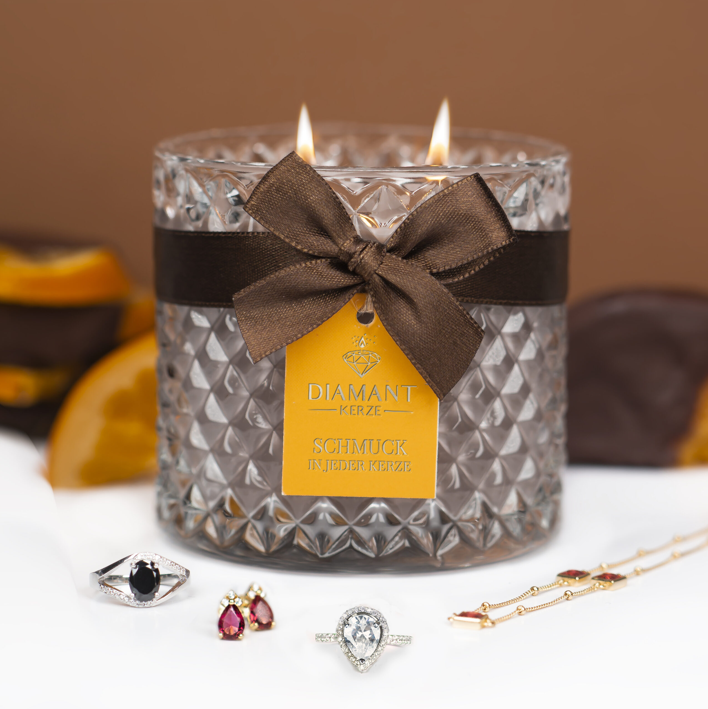 Diamantkerzen werden aus 100 % natürlichem Wachs hergestellt, in dem wir Schmuck aus Sterlingsilber 925 eingegossen haben.